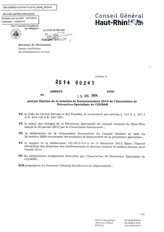 portant fixation de la dotation de fonctionnement 2014 de l'association de prévention spécialisée de COLMAR Resumé Pièces jointes ARRETE Assemblée : Non défini Date : 15/07/2014 Rapporteur : Non défini Collectivité : Conseil départemental du Haut-Rhin Direction : Non défini Service : Direction de l'Autonomie Domaine : Dotations financières Commission :