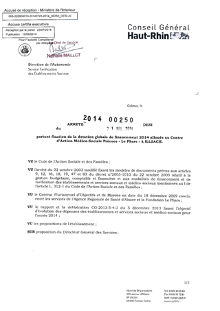 portant fixation de la dotation globale de financement 2014 allouée au Centre d'Action Médico-Sociale Précoce "Le Phare" à ILLZACH. Resumé Pièces jointes ARRETE Assemblée : Non défini Date : 21/07/2014 Rapporteur : Non défini Collectivité : Conseil départemental du Haut-Rhin Direction : Non défini Service : Direction de l'Autonomie Domaine : Dotations financières Commission :