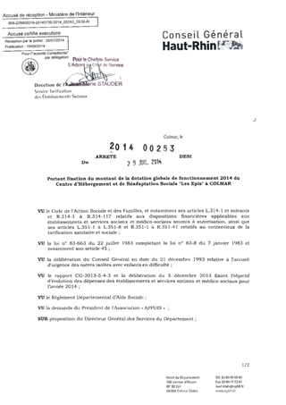 portant fixation du montant de la dotation globale de fonctionnement 2014 du centre d'hébergement et de réadaptation sociale "Les Epis" à COLMAR Resumé Pièces jointes ARRETE Assemblée : Non défini Date : 29/07/2014 Rapporteur : Non défini Collectivité : Conseil départemental du Haut-Rhin Direction : Non défini Service : Direction de l'Autonomie Domaine : Dotations financières Commission :