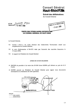 Vente des titres SAPRR détenus par le Conseil Général du Haut-Rhin. Resumé Pièces jointes DELIBERATION RAPPORT Assemblée : Conseil General Date : 30/03/2006 Rapporteur : Non défini Collectivité : Conseil départemental du Haut-Rhin Direction : Non défini Service : Mission Contrôle de Gestion et Organisation Domaine : Commission : Assemblée Départementale
