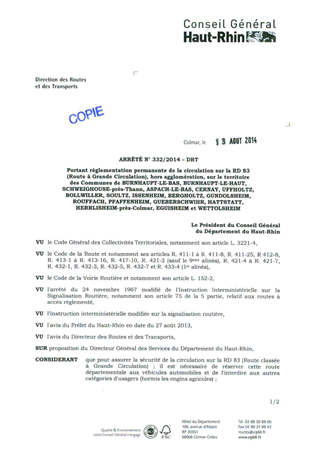 portant réglementation permanente de la circulation sur la RD 83 (route à grande circulation), hors agglomération, sur le territoire des commune de BURNHAUPT LE BAS, BURNHUAPT LE HAUT, SCHWEIGHOUSE près THANN, ASPACH LE BAS, CERNAY, UFFHOLTZ, BOLLWILLER,