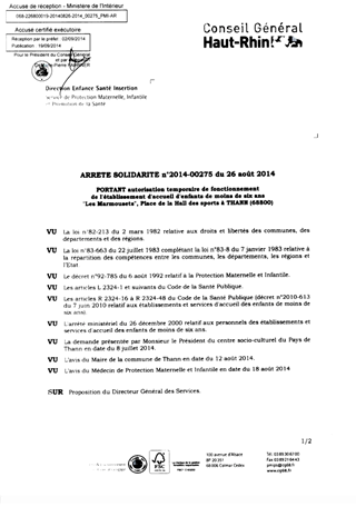 portant autorisation temporaire de fonctionnement de l'établissement d'accueil d'enfants de moins de six ans "Les Marmousets", place de la Hall des sports à THANN (68800) Resumé Pièces jointes ARRETE Assemblée : Non défini Date : 26/08/2014 Rapporteur : Non défini Collectivité : Conseil départemental du Haut-Rhin Direction : Non défini Service : Direction Enfance Santé Insertion Domaine : Accueil d'enfants Commission :