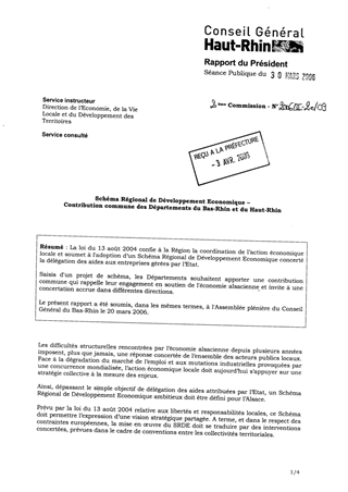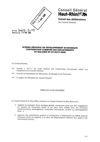 Schéma régional de développement économique. Contribution commune des Départements du Bas-Rhin et du Haut-Rhin. Resumé Pièces jointes DELIBERATION RAPPORT Assemblée : Conseil General Date : 30/03/2006 Rapporteur : Non défini Collectivité : Conseil départemental du Haut-Rhin Direction : Non défini Service : Direction de l'Economie, de la Vie Locale et du Développement des Territoires Domaine : Commission : Assemblée Départementale