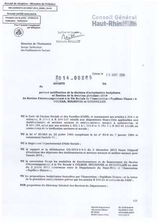 portant notification de la décision d'autorisation budgétaire et fixation de la dotation globalisée 2014 du service d'accompagnement à la vie sociale de l'association "Papillons Blancs" à COLMAR, MULHOUSE et GUEBWILLER Resumé Pièces jointes ARRETE Assemblée : Non défini Date : 26/08/2014 Rapporteur : Non défini Collectivité : Conseil départemental du Haut-Rhin Direction : Non défini Service : Direction de l'Autonomie Domaine : Dotations financières Commission :