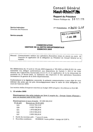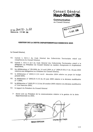 COMMUNICATION. Gestion de la dette départementale. Exercice 2005. Resumé Pièces jointes DELIBERATION RAPPORT Assemblée : Conseil General Date : 30/03/2006 Rapporteur : Non défini Collectivité : Conseil départemental du Haut-Rhin Direction : Non défini Service : Direction des Finances Domaine : Commission : Assemblée Départementale