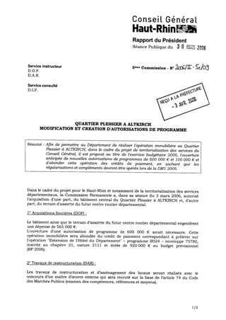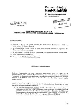 Quartier Plessier à Altkirch - modification et création d'autorisations de programme. Resumé Pièces jointes DELIBERATION RAPPORT Assemblée : Conseil General Date : 30/03/2006 Rapporteur : Non défini Collectivité : Conseil départemental du Haut-Rhin Direction : Non défini Service : Service du Patrimoine et du droit des Sols Domaine : Commission : Assemblée Départementale