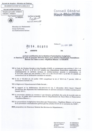 portant notification de la décision d'autorisation budgétaire et fixation du prix de journée 2014 du foyer pour adultes handicapés travailleurs Henner de l'Association "Papillons Blancs" à COLMAR Resumé Pièces jointes ARRETE Assemblée : Non défini Date : 26/08/2014 Rapporteur : Non défini Collectivité : Conseil départemental du Haut-Rhin Direction : Non défini Service : Direction de l'Autonomie Domaine : Prix de Journée Commission :