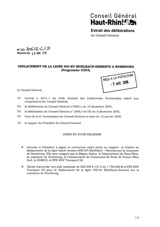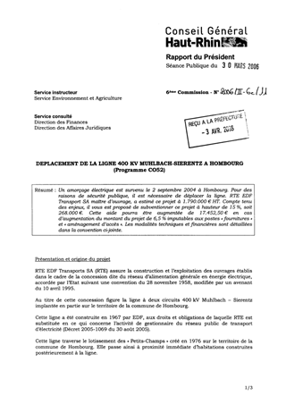 Déplacement de la ligne 400 KV Muhlbach-Sierentz à HOMBOURG (programme CO52). Resumé Pièces jointes DELIBERATION RAPPORT Assemblée : Conseil General Date : 30/03/2006 Rapporteur : Non défini Collectivité : Conseil départemental du Haut-Rhin Direction : Non défini Service : Service Environnement et Agriculture Domaine : Commission : Assemblée Départementale