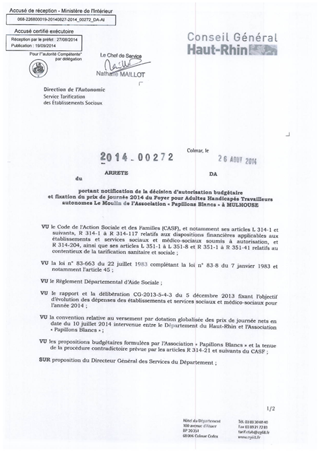 portant notification de la décision d'autorisation budgétaire et fixation du prix de journée 2014 du foyer pour adultes handicapés travailleurs autonomes Le Moulin de l'association "Papillons Blancs" à MULHOUSE Resumé Pièces jointes ARRETE Assemblée : Non défini Date : 26/08/2014 Rapporteur : Non défini Collectivité : Conseil départemental du Haut-Rhin Direction : Non défini Service : Direction de l'Autonomie Domaine : Prix de Journée Commission :