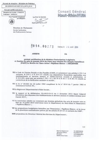 portant notification de la décision d'autorisation budgétaire et fixation du prix de journée 2014 du foyer pour adultes handicapés travailleurs (FAHT) Le Moulin de l'association "Papillons Blancs" à MULHOUSE Resumé Pièces jointes ARRETE Assemblée : Non défini Date : 26/08/2014 Rapporteur : Non défini Collectivité : Conseil départemental du Haut-Rhin Direction : Non défini Service : Direction de l'Autonomie Domaine : Prix de Journée Commission :