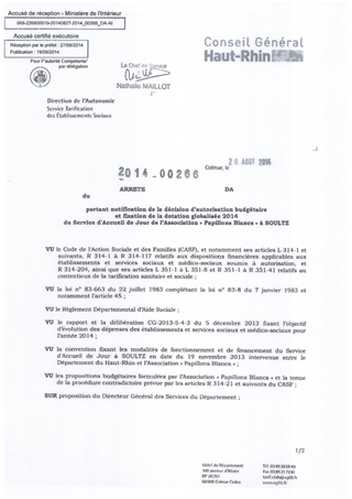 portant notification de la décision d'autorisation budgétaire et fixation de la dotation globalisée 2014 du service d'accueil de jour de l'association "Papillons Blancs" à SOULTZ Resumé Pièces jointes ARRETE Assemblée : Non défini Date : 26/08/2014 Rapporteur : Non défini Collectivité : Conseil départemental du Haut-Rhin Direction : Non défini Service : Direction de l'Autonomie Domaine : Dotations financières Commission :