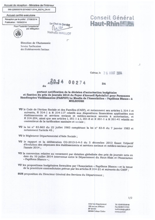 portant notification de la décision d'autorisation budgétaire et fixation du prix de journée 2014 du foyer d'accueil spécialisé pour personnes handicapées vieillissantes (FASPHV) Le Moulin de l'association "Papillons Blancs" à MULHOUSE Resumé Pièces jointes ARRETE Assemblée : Non défini Date : 26/08/2014 Rapporteur : Non défini Collectivité : Conseil départemental du Haut-Rhin Direction : Non défini Service : Direction de l'Autonomie Domaine : Prix de Journée Commission :
