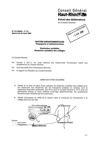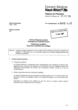 Routes départementales. Transports et Infrastructures. Itinéraires cyclables. Dessertes cyclables des collèges. Resumé Pièces jointes DELIBERATION RAPPORT Assemblée : Conseil General Date : 30/03/2006 Rapporteur : Non défini Collectivité : Conseil départemental du Haut-Rhin Direction : Non défini Service : Service Entretien Exploitation Sécurité Domaine : Commission : Assemblée Départementale