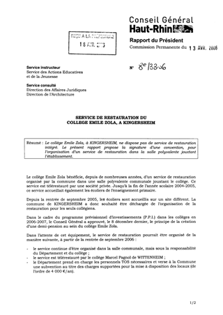 Service de restauration du collège Emile Zola à Kingersheim. Resumé Pièces jointes DELIBERATION RAPPORT Assemblée : Commission Permanente Date : 13/04/2006 Rapporteur : Non défini Collectivité : Conseil départemental du Haut-Rhin Direction : Non défini Service : Service des Actions Éducatives Domaine : Commission : Commission Permanente