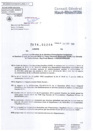 portant notification de la décision d'autorisation budgétaire et fixation du prix de journée 2014 du foyer d'accueil médicalisé (FAM) Cap Cornely de l'association "Papillons Blancs" à BOURTZWILLER Resumé Pièces jointes ARRETE Assemblée : Non défini Date : 22/09/2014 Rapporteur : Non défini Collectivité : Conseil départemental du Haut-Rhin Direction : Non défini Service : Direction de l'Autonomie Domaine : Prix de Journée Commission :