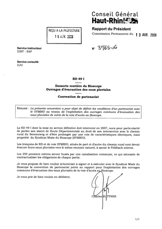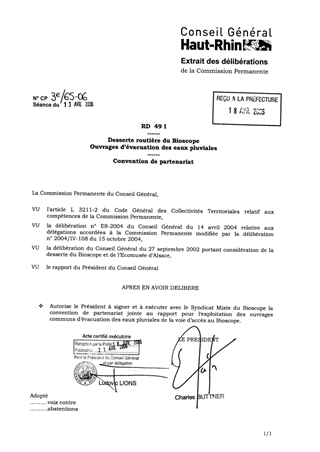 RD 49 I. Desserte routière du Bioscope. Ouvrages d'évacuation des eaux pluviales. Convention de partenariat. Resumé Pièces jointes DELIBERATION RAPPORT Assemblée : Commission Permanente Date : 13/04/2006 Rapporteur : Non défini Collectivité : Conseil départemental du Haut-Rhin Direction : Non défini Service : Unité Comptabilité Subventions Domaine : Commission : Commission Permanente