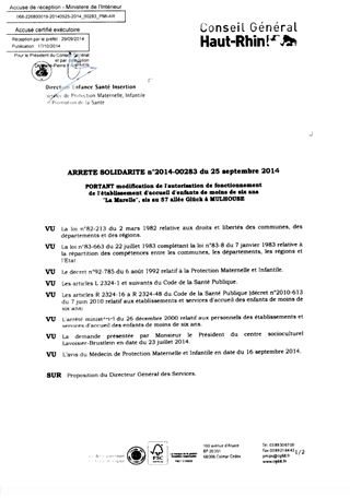 portant modification de l'autorisation de fonctionnement de l'établissement d'accueil d'enfants de moins de six ans "La Marelle", sis au 57 allée Glück à MULHOUSE Resumé Pièces jointes ARRETE Assemblée : Non défini Date : 25/09/2014 Rapporteur : Non défini Collectivité : Conseil départemental du Haut-Rhin Direction : Non défini Service : Direction Enfance Santé Insertion Domaine : Accueil d'enfants Commission :