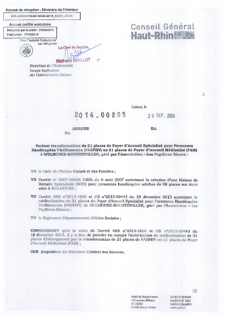 portant transformation de 21 places de foyer d'accueil spécialisé pour personnes handicapées vieillissantes (FASPHV) en 21 places de foyer d'accueil médicalisé (FAM) à MULHOUSE-BOURTZWILLER, géré par l'association "Les Papillons Blancs" Resumé Pièces jointes ARRETE Assemblée : Non défini Date : 26/09/2014 Rapporteur : Non défini Collectivité : Conseil départemental du Haut-Rhin Direction : Non défini Service : Direction de l'Autonomie Domaine : Autres (non classés) Commission :
