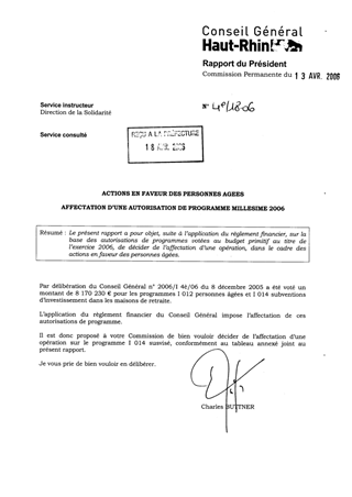 Actions en faveur des personnes âgées. Affectation d'une autorisation de programme. Millésime 2006 Resumé Pièces jointes DELIBERATION RAPPORT Assemblée : Commission Permanente Date : 13/04/2006 Rapporteur : Non défini Collectivité : Conseil départemental du Haut-Rhin Direction : Non défini Service : Direction de la Solidarité Domaine : Commission : Commission Permanente