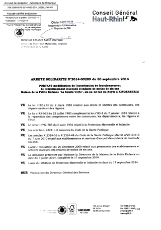 portant notification de l'autorisation de fonctionnement de l'établissement d'accueil d'enfants de moins de six ans Maison de la Petite Enfance "La Souris Verte", sis au 12 rue du Noyer à KINGERSHEIM Resumé Pièces jointes ARRETE Assemblée : Non défini Date : 30/09/2014 Rapporteur : Non défini Collectivité : Conseil départemental du Haut-Rhin Direction : Non défini Service : Direction Enfance Santé Insertion Domaine : Accueil d'enfants Commission :