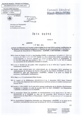 portant modification de l'arrêté n°2014-00262 du 8.08.2014 portant notification de la décision d'autorisation budgétaire et fixation du prix de journée 2014 du service d'accueil de jour (SAJ) de l'association ALISTER à MULHOUSE et COLMAR Resumé Pièces jointes ARRETE Assemblée : Non défini Date : 07/10/2014 Rapporteur : Non défini Collectivité : Conseil départemental du Haut-Rhin Direction : Non défini Service : Direction de l'Autonomie Domaine : Prix de Journée Commission :