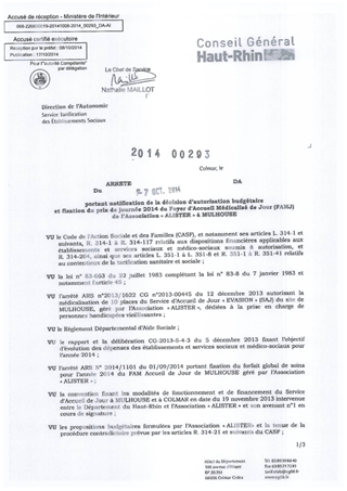 portant notification de la décision d'autorisation budgétaire et fixation du prix de journée 2014 du foyer d'accueil médicalisé de jour (FAMJ) de l'association "ALISTER" à MULHOUSE Resumé Pièces jointes ARRETE Assemblée : Non défini Date : 07/10/2014 Rapporteur : Non défini Collectivité : Conseil départemental du Haut-Rhin Direction : Non défini Service : Direction de l'Autonomie Domaine : Prix de Journée Commission :