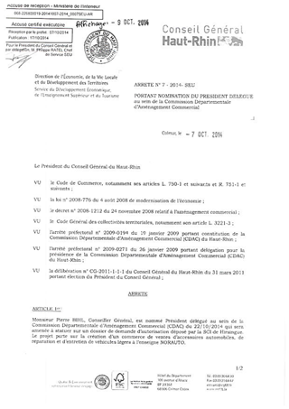portant nomination du Président Délégué au sein de la Commission Départementale d'Aménagement Commercial. Resumé Pièces jointes ARRETE Assemblée : Non défini Date : 07/10/2014 Rapporteur : Non défini Collectivité : Conseil départemental du Haut-Rhin Direction : Non défini Service : Direction de l'Aménagement du Territoire et de l'Economie Domaine : Autres (non classés) Commission :