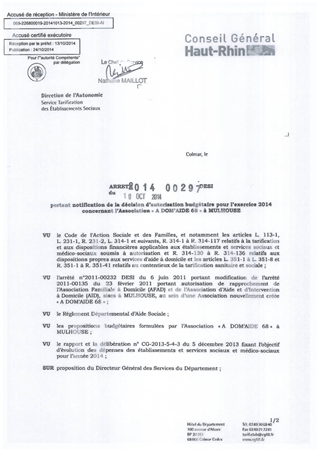portant notification de la décision d'autorisation budgétaire pour l'exercice 2014 concernant l'association "A DOM'AIDE 68" à MULHOUSE Resumé Pièces jointes ARRETE Assemblée : Non défini Date : 10/10/2014 Rapporteur : Non défini Collectivité : Conseil départemental du Haut-Rhin Direction : Non défini Service : Direction de l'Autonomie Domaine : Dotations financières Commission :