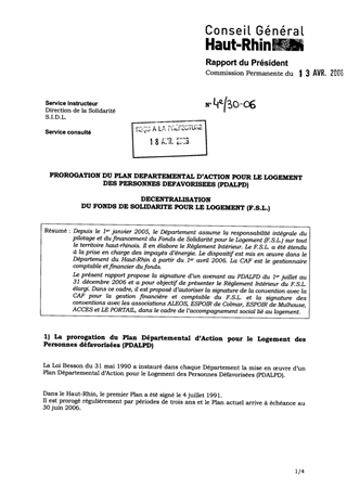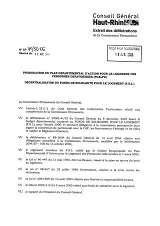 Prorogation du plan départemental d'action pour le logement des personnes défavorisées (PDALPD). Décentralisation du FSL Resumé Pièces jointes DELIBERATION RAPPORT Assemblée : Commission Permanente Date : 13/04/2006 Rapporteur : Non défini Collectivité : Conseil départemental du Haut-Rhin Direction : Non défini Service : Direction de la Solidarité Domaine : Commission : Commission Permanente