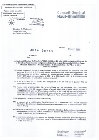 portant notification de l'arrêté n°2014-00221 du 26.06.2014 portant notification de la décision d'autorisation budgétaire et fixation du prix de journée 2014 du foyer d'accueil spécialisé "Maison Emilie" de l'association "Au Fil de la Vie" à MALMERSPACH