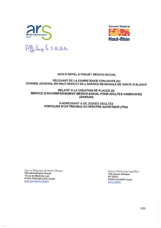 médico-social relevant de la compétence conjointe du Conseil Général du Haut-Rhin et de l'Agence Régionale de Santé d'Alsace relatif à la création de places de service d'accompagnement médico-social pour adultes handicapés (SAMSAH) s'adressant à de jeunes