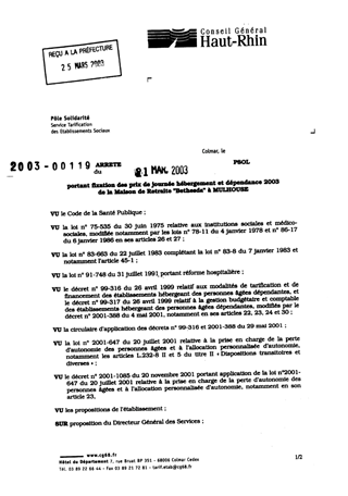 portant fixation des prix de journée hébergement et dépendance 2003 de la maison de retraite "Bethesda" à MULHOUSE. Resumé Pièces jointes ARRETE Assemblée : Non défini Date : 21/03/2003 Rapporteur : Non défini Collectivité : Conseil départemental du Haut-Rhin Direction : Non défini Service : Direction de la Solidarité Domaine : Prix de Journée Commission :