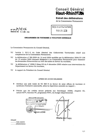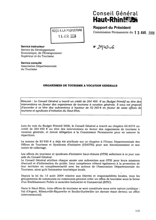 Organismes de tourisme à vocation générale Resumé Pièces jointes DELIBERATION RAPPORT Assemblée : Commission Permanente Date : 13/04/2006 Rapporteur : Non défini Collectivité : Conseil départemental du Haut-Rhin Direction : Non défini Service : Service Développement Economique Domaine : Commission : Commission Permanente
