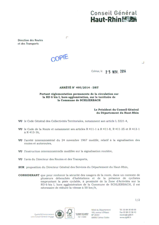 portant réglementation permanente de la circulation sur la RD 6 bis I, hors agglomération, sur le territoire de la Commune de SCHLIERBACH Resumé Pièces jointes ARRETE Assemblée : Non défini Date : 25/11/2014 Rapporteur : Non défini Collectivité : Conseil départemental du Haut-Rhin Direction : Non défini Service : Direction des Routes Domaine : Circulation Commission :
