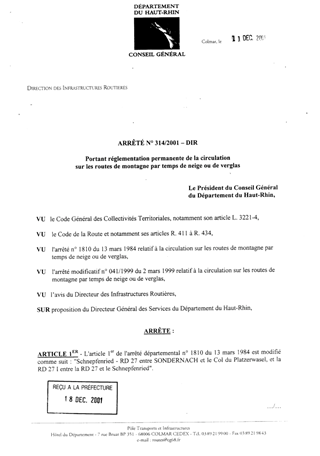 portant réglementation permanente de la circulation sur les routes de montagne par temps de neige ou de verglas Resumé Pièces jointes ARRETE Assemblée : Non défini Date : 11/12/2001 Rapporteur : Non défini Collectivité : Conseil départemental du Haut-Rhin Direction : Non défini Service : Direction des Routes Domaine : Circulation Commission :