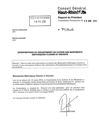 Interventions du Département en faveur des monuments historiques classés et inscrits. Resumé Pièces jointes DELIBERATION RAPPORT Assemblée : Commission Permanente Date : 13/04/2006 Rapporteur : Non défini Collectivité : Conseil départemental du Haut-Rhin Direction : Non défini Service : Service du Patrimoine et de la Conservation Domaine : Commission : Commission Permanente