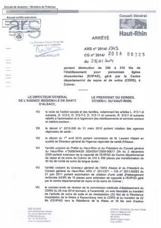 portant diminution de 350 à 310 lits de l'établissement pour personnes âgées dépendantes (EHPAD), géré par le centre départemental de repos et de soins (CDRS), à COLMAR. Resumé Pièces jointes ARRETE Assemblée : Non défini Date : 28/11/2014 Rapporteur : Non défini Collectivité : Conseil départemental du Haut-Rhin Direction : Non défini Service : Direction Etudes, Finances et Appuis de la Solidarité Domaine : Personnes Agées Commission :