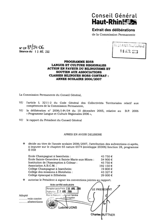 Programme E058. Langue et Culture Régionales. Actions en faveur du bilinguisme et soutien aux associations classes bilingues hors contrat : année scolaire 2006/2007. Resumé Pièces jointes DELIBERATION RAPPORT Assemblée : Commission Permanente Date : 13/04/2006 Rapporteur : Non défini Collectivité : Conseil départemental du Haut-Rhin Direction : Non défini Service : Mission langue et culture régionales Domaine : Commission : Commission Permanente