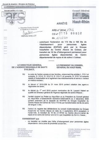 autorisant l'extension de 172 lits à 190 lits de l'établissement pour personnes âgées dépendantes (EHPAD) géré par le groupe hospitalier du Centre Alsace de COLMAR, par transfert de 18 lits d'hébergement permanent pour personnes âgées dépendantes du Centr