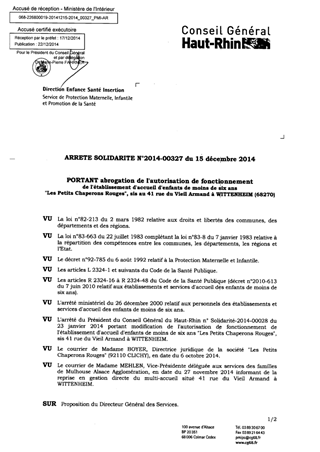 portant abrogation de l'autorisation de fonctionnement de l'établissement d'accueil d'enfants de moins de six ans "Les Petits Chaperons Rouges", sis au 41 rue du Vieil Armand à WITTENHEIM (68270) Resumé Pièces jointes ARRETE Assemblée : Non défini Date : 15/12/2014 Rapporteur : Non défini Collectivité : Conseil départemental du Haut-Rhin Direction : Non défini Service : Direction Enfance Santé Insertion Domaine : Accueil d'enfants Commission :