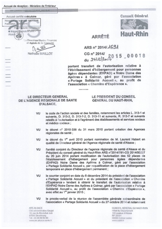portant transfert de l'autorisation relative à l'établissement d'hébergement pour personnes âgées dépendantes (EHPAD) "Notre Dame des Apôtres" à COLMAR, géré par l'association "Partage Solidarité Accueil", au profit de l'association "Chemins d'Espérance".