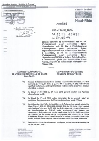 portant transfert de l'autorisation des 98 lits d'hébergement pour personnes âgées dépendantes, soit 60 lits à l'établissement d'hébergement pour personnes âgées dépendantes (EHPAD) "Maison St Antoine" à ISSENHEIM, et 38 lits à l'établissement d'hébergeme