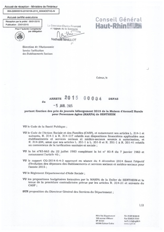 portant fixation des prix de journée hébergement 2015 de la Maison d'Accueil Rurale pour Personnes Agées (MARPA) de SENTHEIM Resumé Pièces jointes ARRETE Assemblée : Non défini Date : 05/01/2015 Rapporteur : Non défini Collectivité : Conseil départemental du Haut-Rhin Direction : Non défini Service : Direction de l'Autonomie Domaine : Prix de Journée Commission :