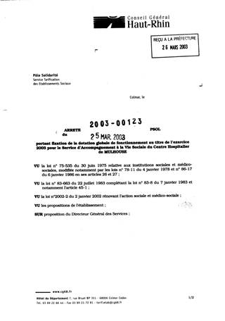 portant fixation de la dotation globale de fonctionnement au titre de l'exercice 2003 pour le service d'accompagnement à la vie sociale du centre hospitalier de MULHOUSE. Resumé Pièces jointes ARRETE Assemblée : Non défini Date : 25/03/2003 Rapporteur : Non défini Collectivité : Conseil départemental du Haut-Rhin Direction : Non défini Service : Direction de la Solidarité Domaine : Dotations financières Commission :