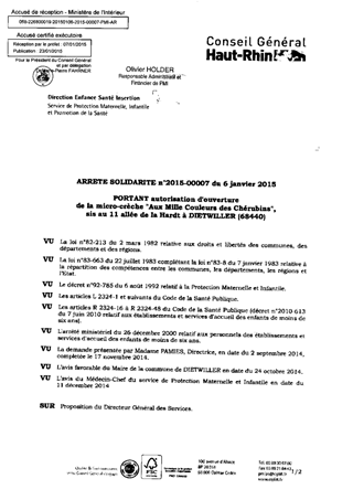 portant autorisation d'ouverture de la micro-crèche "Aux Mille Couleurs des Chérubins", sis au 11 allée de la Hardt à DIETWILLER (68440) Resumé Pièces jointes ARRETE Assemblée : Non défini Date : 06/01/2015 Rapporteur : Non défini Collectivité : Conseil départemental du Haut-Rhin Direction : Non défini Service : Direction Enfance Santé Insertion Domaine : Accueil d'enfants Commission :
