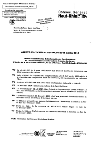 portant modification de l'autorisation de fonctionnement del'établissement d'accueil d'enfants de moins de six ans "L'Atelier de la Vie - Jardins d'enfants", sis au 190 avenue Aristide Briand à MULHOUSE Resumé Pièces jointes ARRETE Assemblée : Non défini Date : 06/01/2015 Rapporteur : Non défini Collectivité : Conseil départemental du Haut-Rhin Direction : Non défini Service : Direction Enfance Santé Insertion Domaine : Accueil d'enfants Commission :