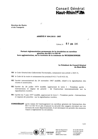 portant réglementation permanente de la circulation au carrefour giratoire des RD 4 et RD 45, hors agglomération, sur le territoire de la commune de WICKERSCHWIHR Resumé Pièces jointes ARRETE Assemblée : Non défini Date : 07/01/2015 Rapporteur : Non défini Collectivité : Conseil départemental du Haut-Rhin Direction : Non défini Service : Direction des Routes Domaine : Circulation Commission :