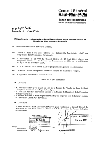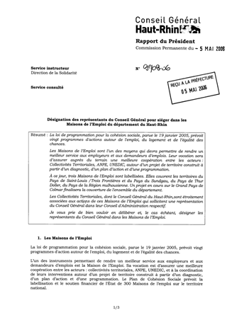 Désignation des représentants du Conseil Général pour siéger dans les maisons de l'emploi du Département du Haut-Rhin Resumé Pièces jointes DELIBERATION RAPPORT Assemblée : Commission Permanente Date : 05/05/2006 Rapporteur : Non défini Collectivité : Conseil départemental du Haut-Rhin Direction : Non défini Service : Direction de la Solidarité Domaine : Commission : Commission Permanente