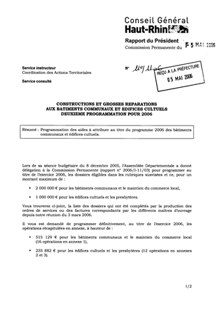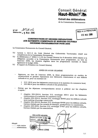 Constructions et grosses répérations aux bâtiments communaux et édifices cultuels. 2ème programme pour 2006 Resumé Pièces jointes DELIBERATION RAPPORT Assemblée : Commission Permanente Date : 05/05/2006 Rapporteur : Non défini Collectivité : Conseil départemental du Haut-Rhin Direction : Non défini Service : Service de la coordination et des actions territoriales Domaine : Transports / Routes Commission : Commission Permanente