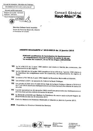 portant modification de l'autorisation de fonctionnement de l'établissement d'accueil d'enfants de moins de six ans "Le moulin des couleurs", sis au 43 rue d'Agen à MULHOUSE Resumé Pièces jointes ARRETE Assemblée : Non défini Date : 13/01/2015 Rapporteur : Non défini Collectivité : Conseil départemental du Haut-Rhin Direction : Non défini Service : Direction Enfance Santé Insertion Domaine : Accueil d'enfants Commission :